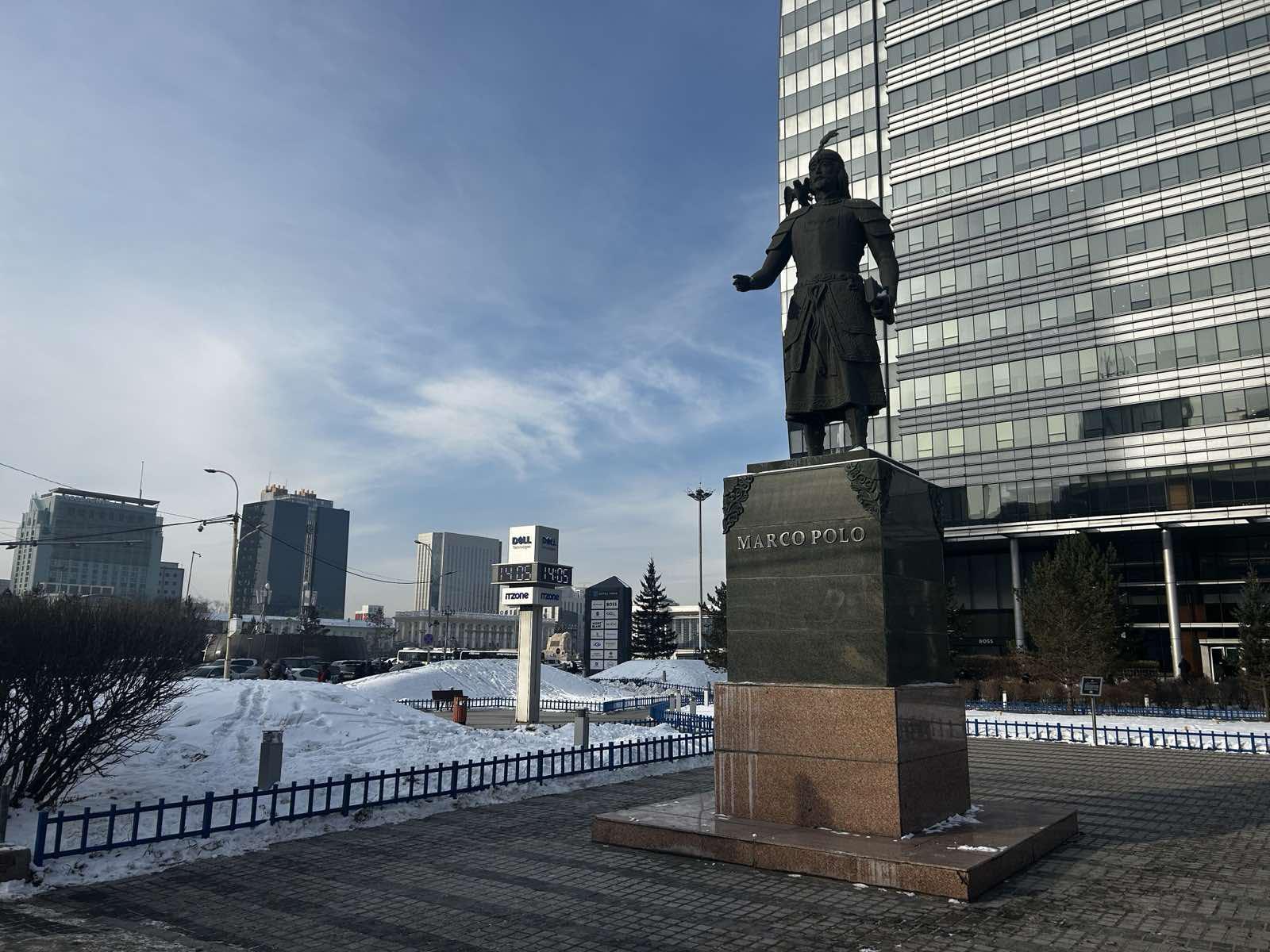 Photo: The Statue of Marco Polo stands in the center of Mongolia’s capital – Ulaanbaatar, across the street from the Foreign Ministry of Mongolia. At the background are seen Mongolia’s State Palace and Ulaanbaatar City Hall.